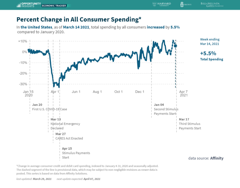 The economic data continues to get better. March job growth came in much stronger than expected, with 916,000 jobs added. Unsurprisingly, given that employment news, consumer confidence bounced to a pandemic high. As we can see in the chart below, consumer spending bounced from 1.6 percent below pre-pandemic levels to 5.5 percent above pre-pandemic levels—a significant improvement. Also in March, business confidence moved to a decade-plus high. Better spring weather and the federal stimulus package should continue to be a tailwind, so we are likely through the worst of the economic impact of the pandemic.
