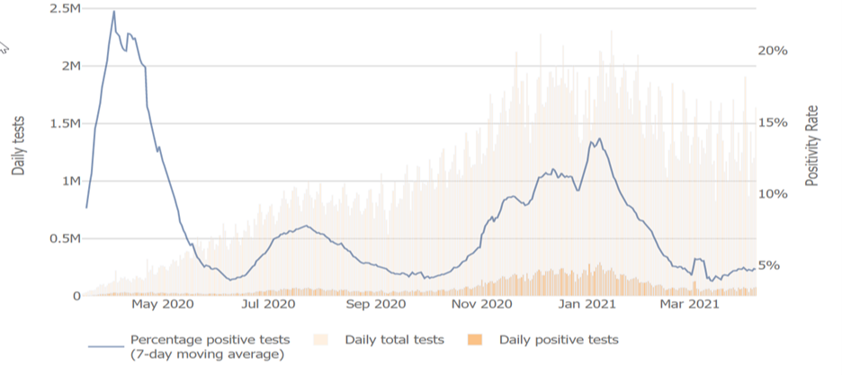 Testing news. The testing news is also showing signs of stabilization after having experienced some deterioration. Overall testing numbers have stayed at roughly the same level for the past couple of weeks, and the positive test rate remains below 5 percent. Although we would benefit from more testing, the continued low level of positive testing rates is supporting evidence that conditions remain reasonably favorable. It could also be a leading indicator that medical risks remain contained.