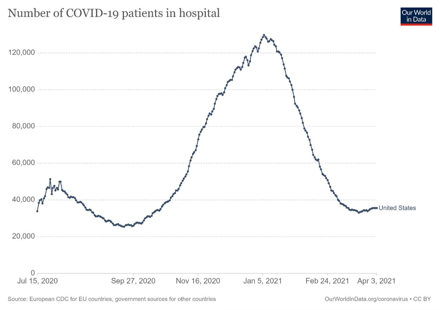 Vaccinations. Finally, in more good news, the vaccination process continues to accelerate. More than a third of the U.S. population has had the first shot of the vaccine, compared with a quarter of the population two weeks ago. In addition, 20 percent of our population has been fully vaccinated. This progress has certainly helped keep hospitalizations low, and it has very likely helped contain the number of new infections. Vaccination continues at a high rate, and this trend is likely to continue over the next several weeks. As of now, it is very possible that everyone who wants the vaccine could be vaccinated by the summer.